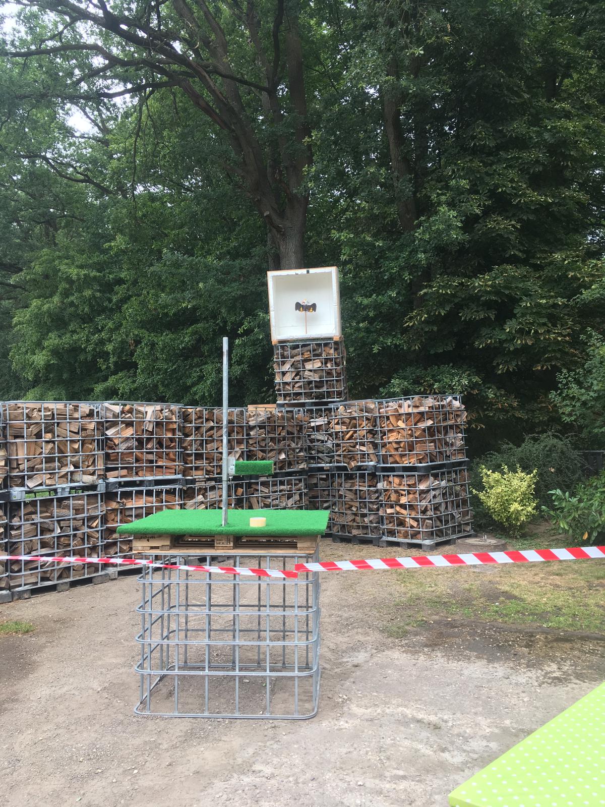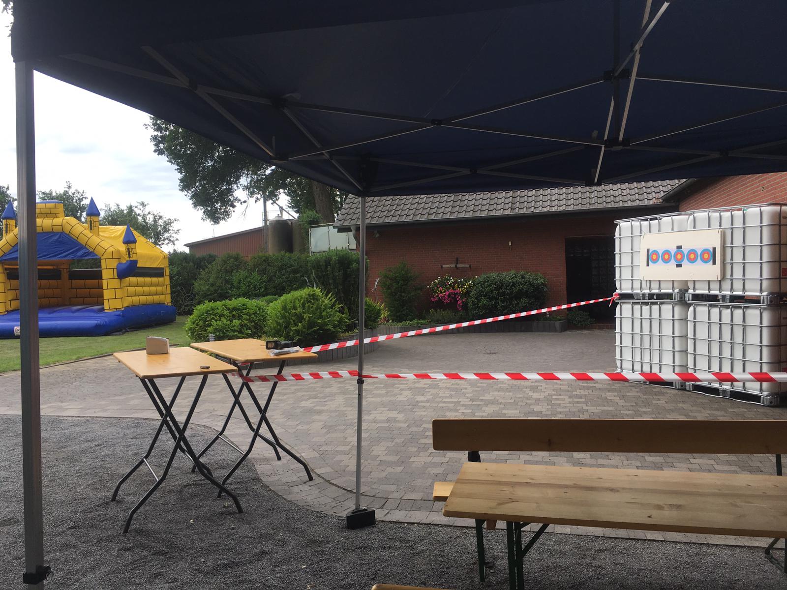 Damit in diesem Jahr Jung und Alt gut unterhalten wurden, hatten wir uns einiges ausgedacht. Zum einen installierten wir unsere hochmoderne Reddot Anlage, einem Lasergewehr womit sich schon Kinder unter 12 Jahren am Schießsport ausprobieren können. Von unseren Schießfreunden aus Rhade leiten wir uns ein besonderes Schießgerät aus, ein Blasrohr. Als Highlight für Kinder gab es eine überdachte Hüpfburg. Natürlich durften die Klassiker wie Dart, Kicker, Armbrust schießen und der heiße Draht nicht fehlen. Auch das allseits beliebte Nagelklopfen wurde bis zur späteren Stunde noch genutzt.