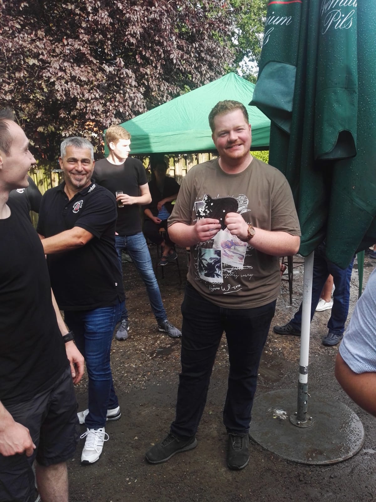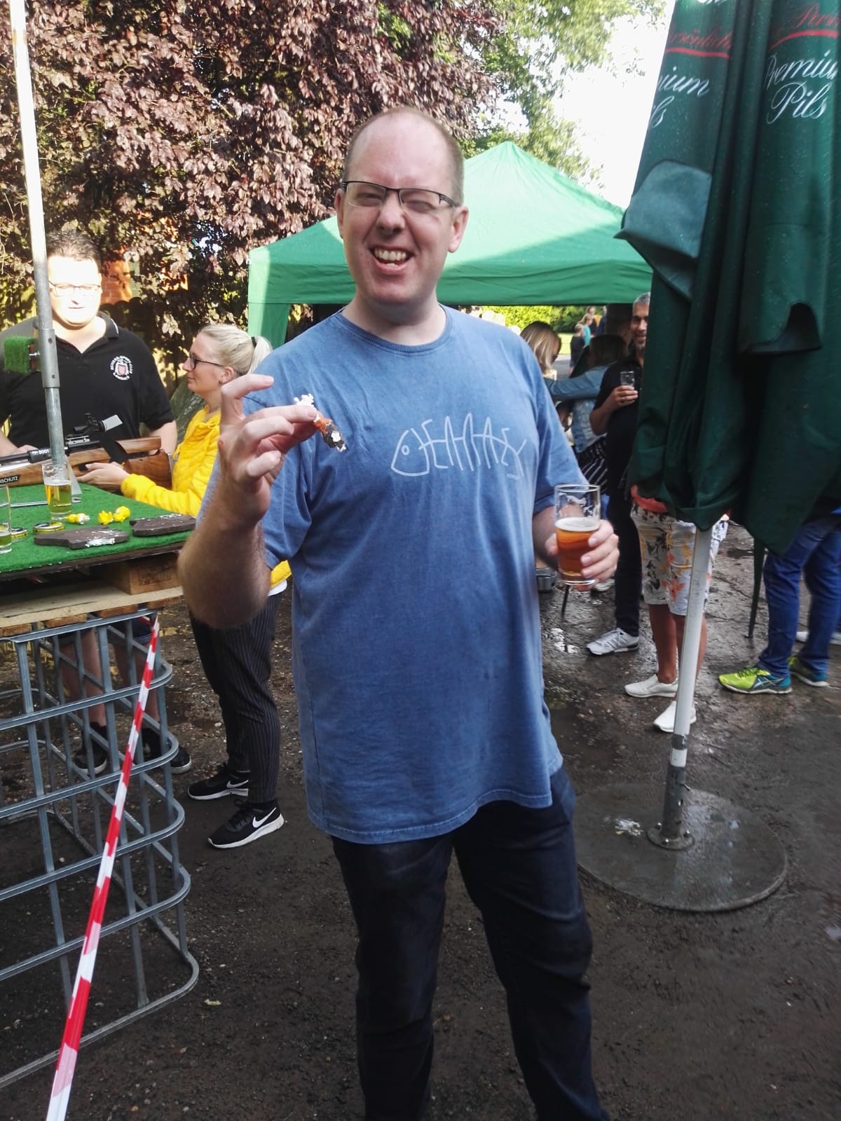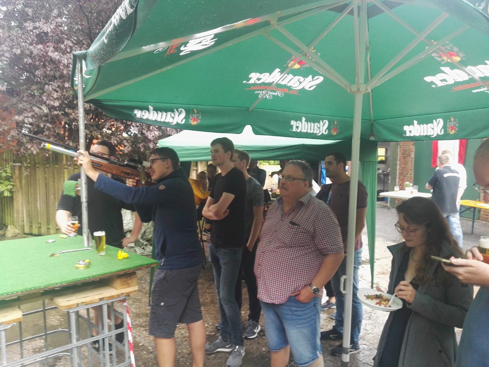 Um 17.00 Uhr begann das Schießen um die Königswürde. Leider wurden wir schon kurz nach Beginn des Schießens von einem kurzen aber sehr heftigen Unwetter heimgesucht, sodass wir zu einer längeren Schießpause gezwungen wurden. Das Unwetter hatte dabei leider unseren großen Pavillon in Mitleidenschaft gezogen und so mancher Besucher, als auch der Grill bekam eine kostenlose Dusche. Trotzdem ließ sich niemand die Stimmung vermiesen und so packten alle Gäste mit an um kleinere Sturmschäden zu beseitigen und die Grillkohle wieder zum Glühen zu bringen. Anschließend zeigte sich wieder einmal der außergewöhnliche Zusammenhalt im Verein, so konnten einige Spenden für den kaputten Pavillon in kurzer Zeit gesammelt werden.